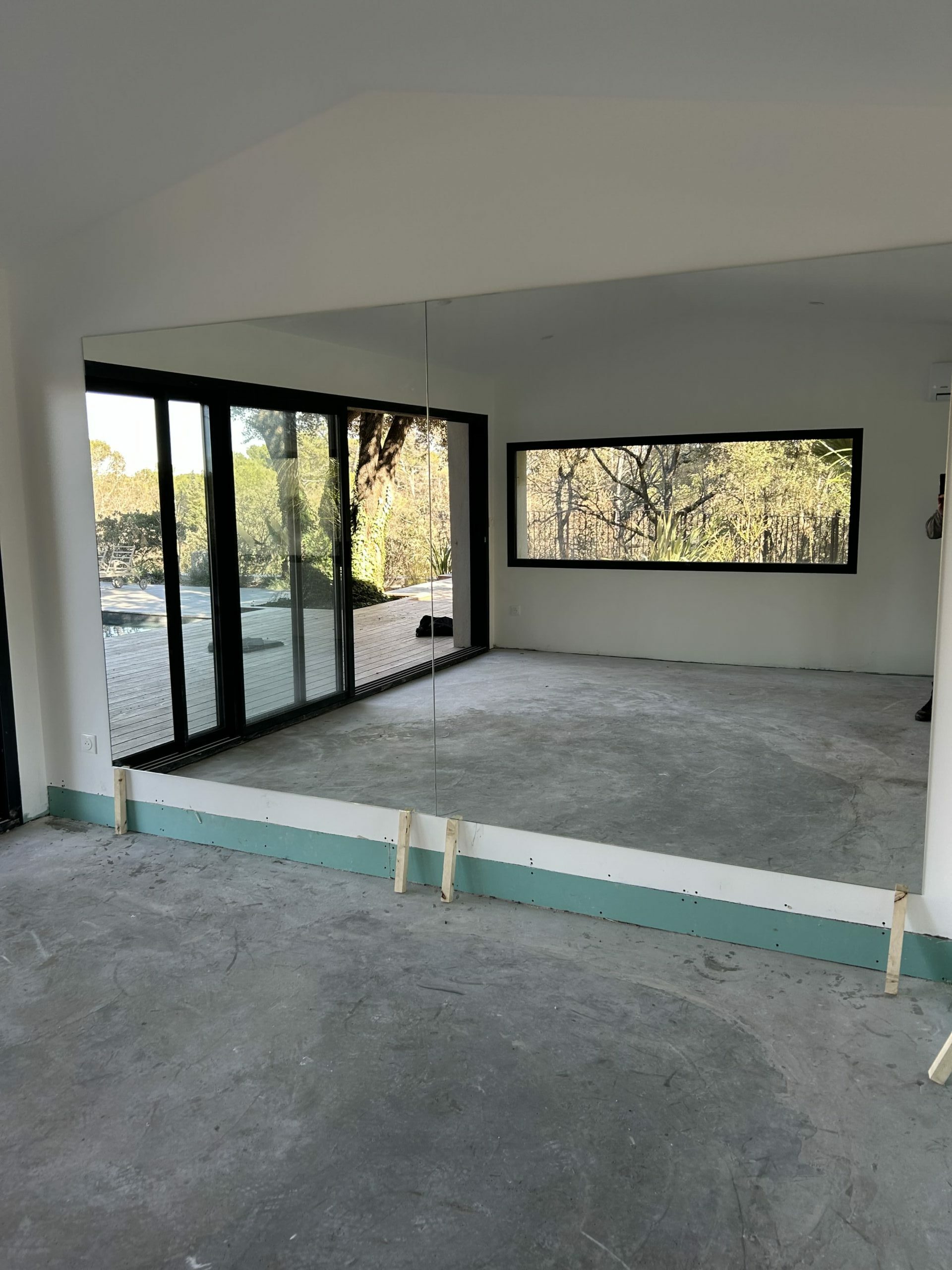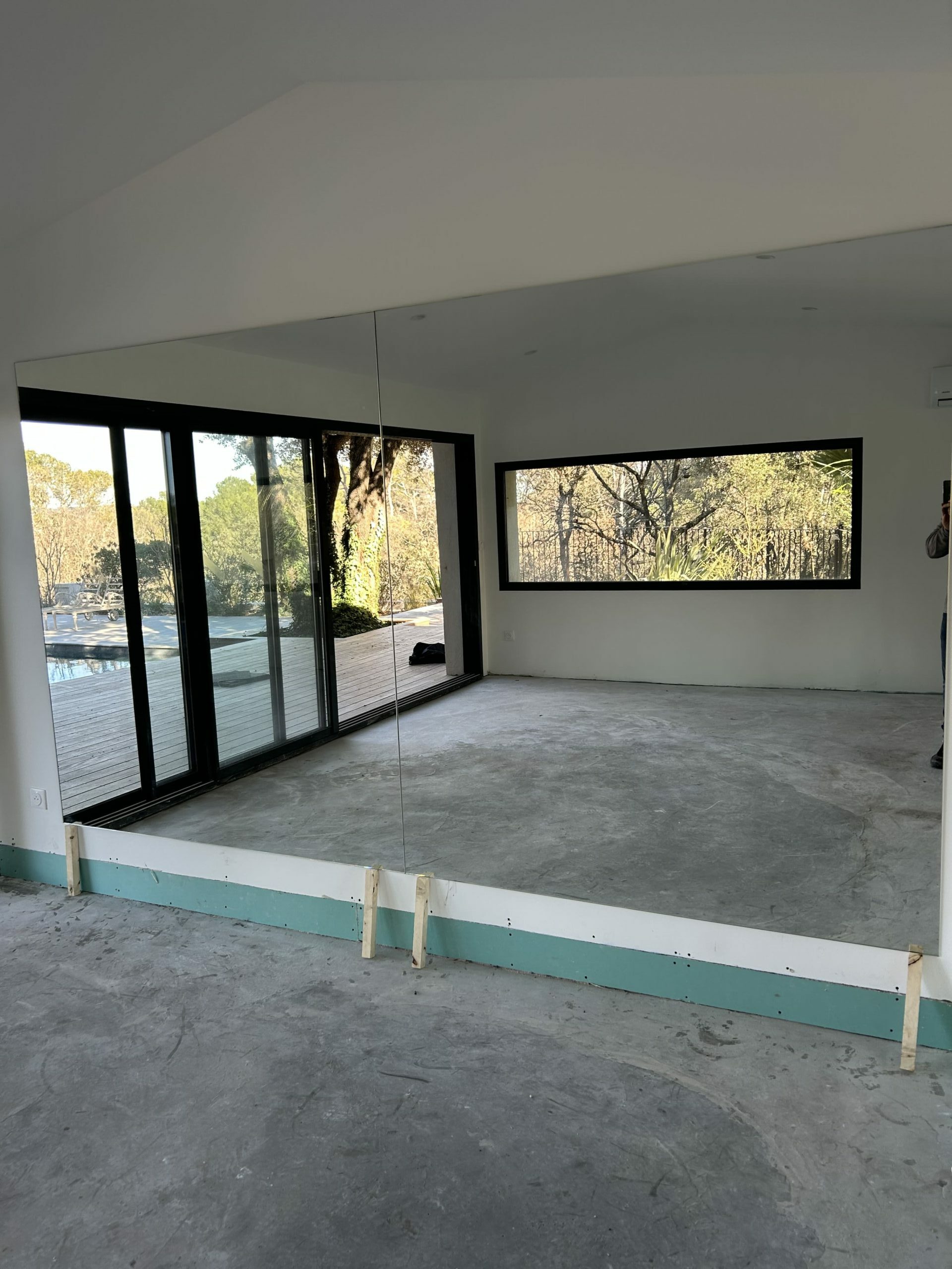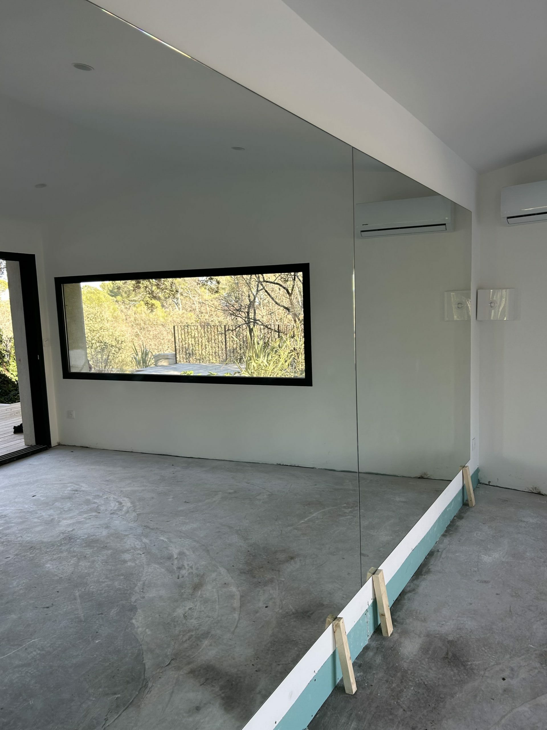 Les miroirs ont été directement collés au mur. Ils sont soutenus par des cales bois comme sur la photo le temps que la colle se fige.