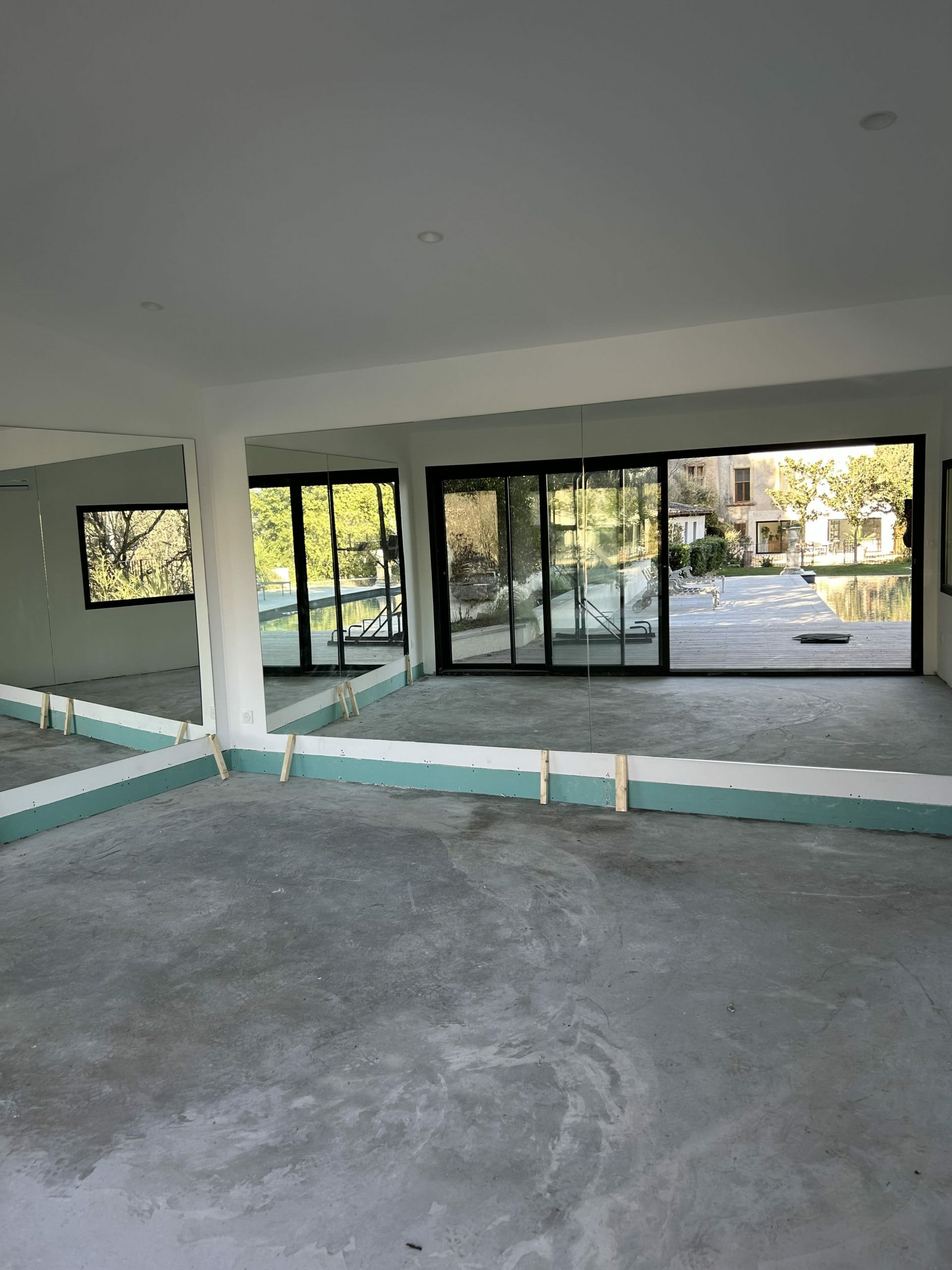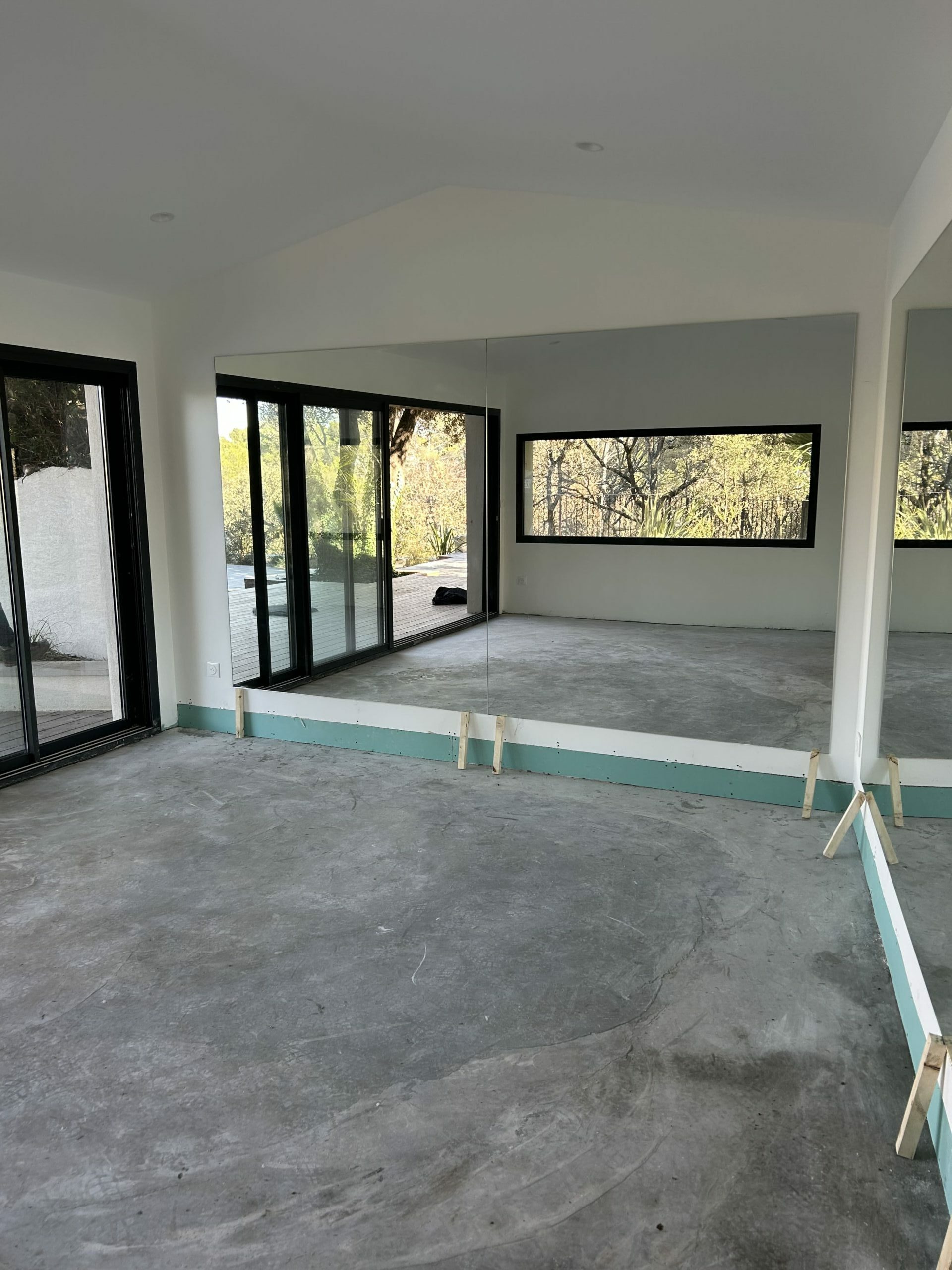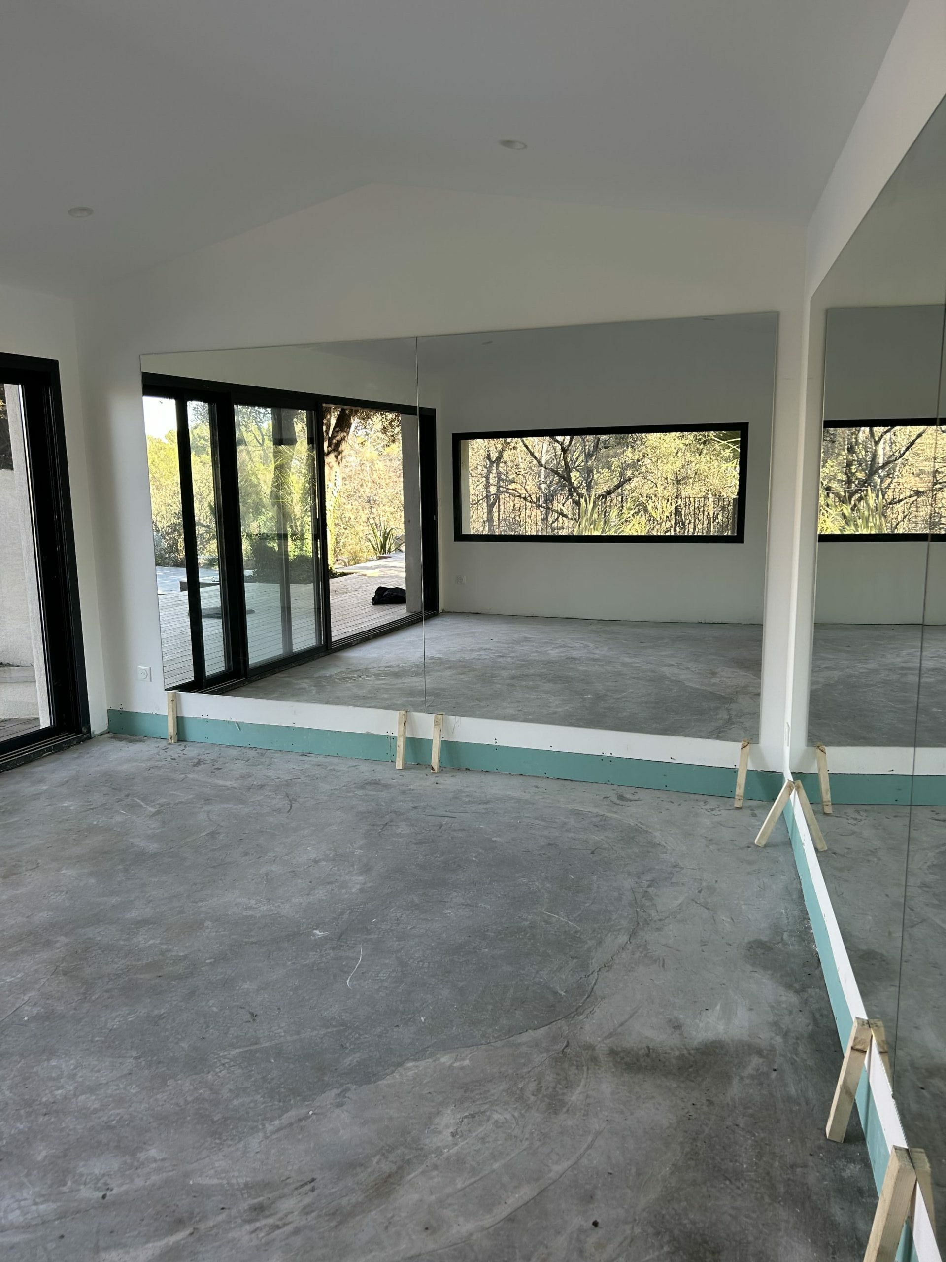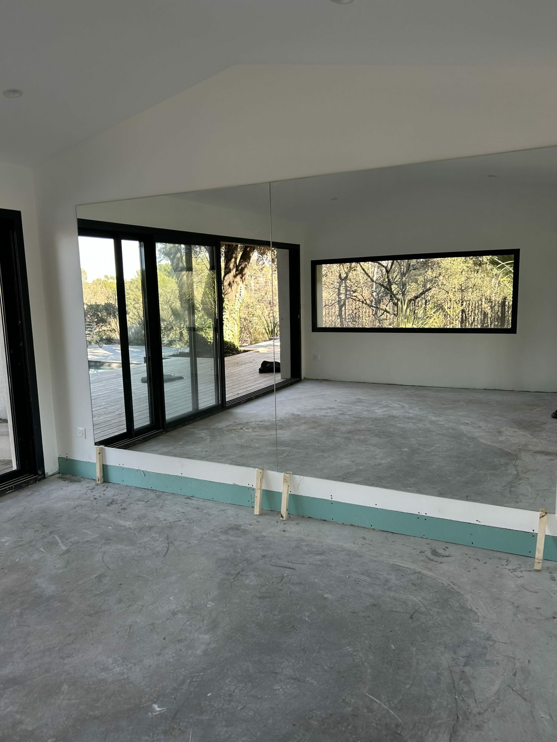 Les miroirs ont été directement collés au mur. Ils sont soutenus par des cales bois comme sur la photo le temps que la colle se fige.